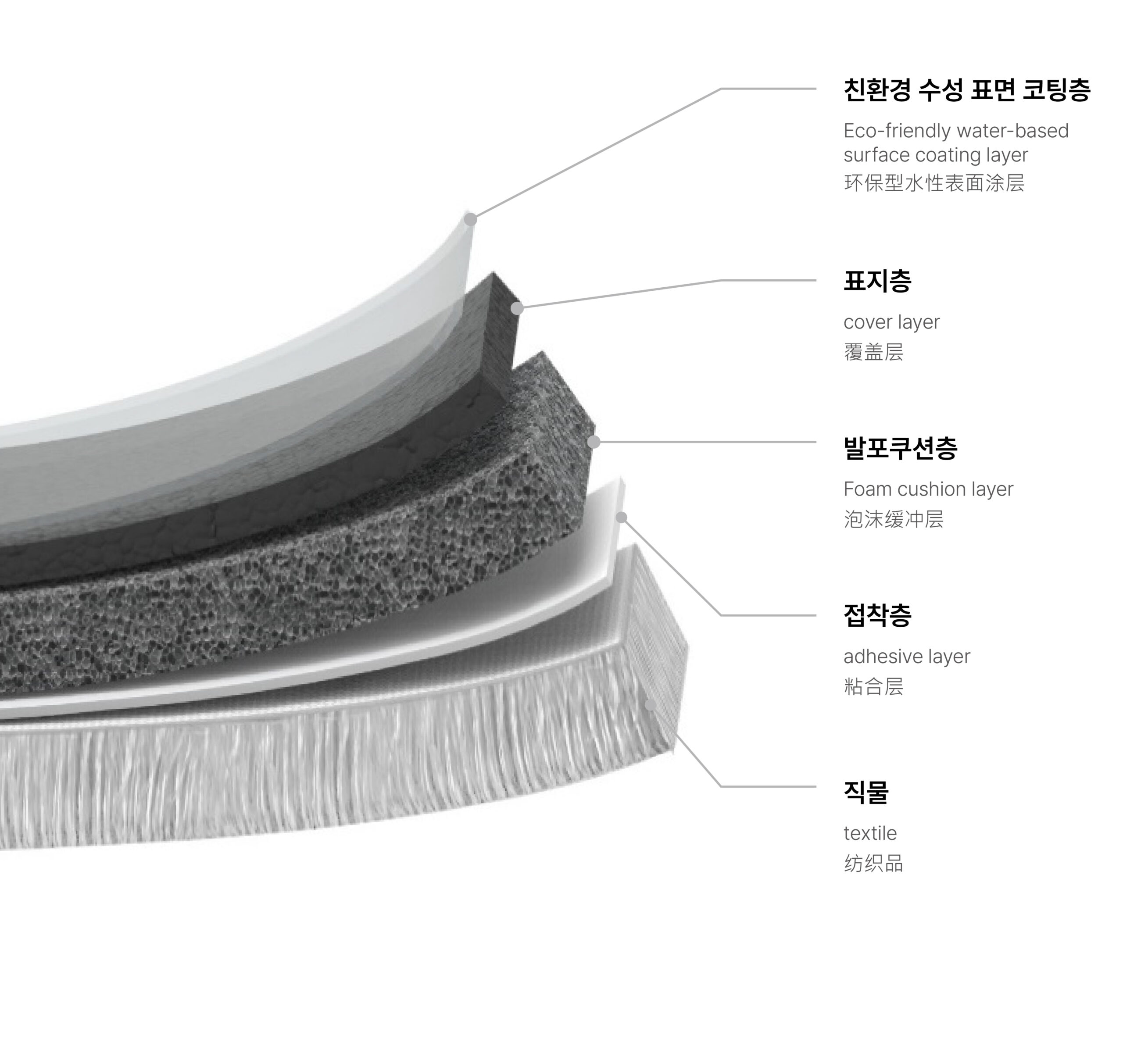 이 프리미엄 소재는 최고의 촉감 경험을 제공하며, 휘발성 유기화합물(VOC)과 냄새, 열 노화, 난연성 등 까다로운 기준을 완벽히 만족시킵니다.