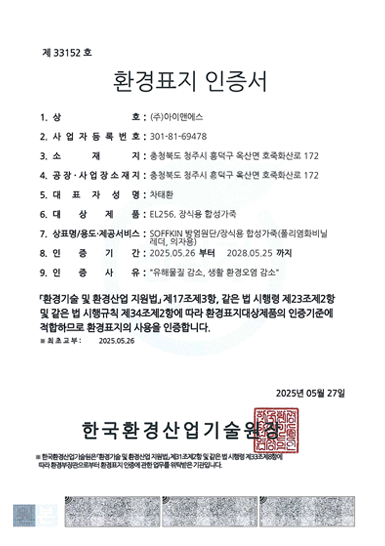 SOFFKIN® 방염원단은 한국환경산업기술원의 환경표지인증(EL256.장식용 인조피혁)을 취득한 제품으로 조달청 입찰시 가산점 적용, 공공기관의 의무 구매, 지자체 및 정부 운영제도에서의 혜택 등이 가능합니다.