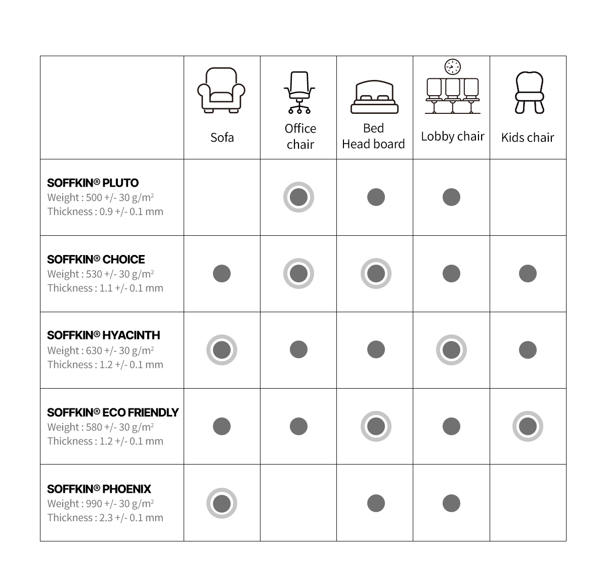 Typical SOFFKIN® Series Recommended for Furniture